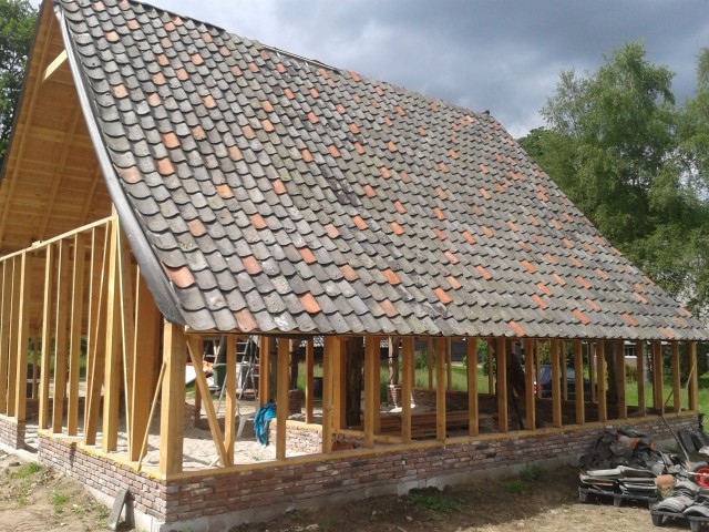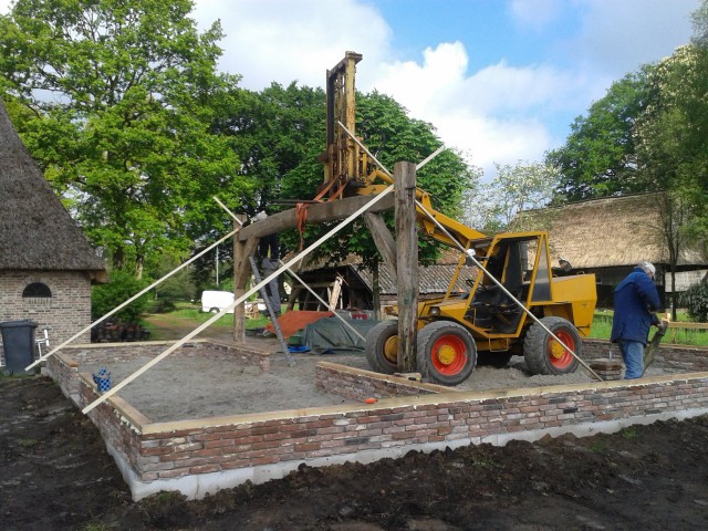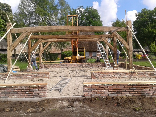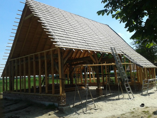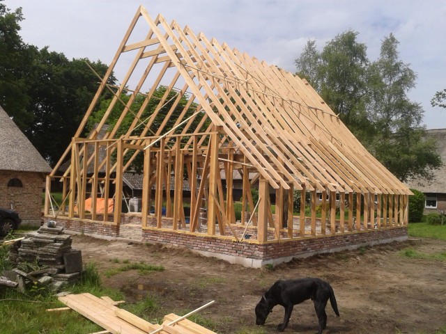 Op de muren en poeren werden de gebinten geplaatst.
