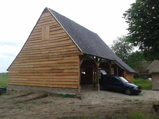 De schuur kreeg oude eiken gebinten om een authentieke uitstraling te krijgen. De gebinten waren afkomstig van een oude schuur in Gelderland.